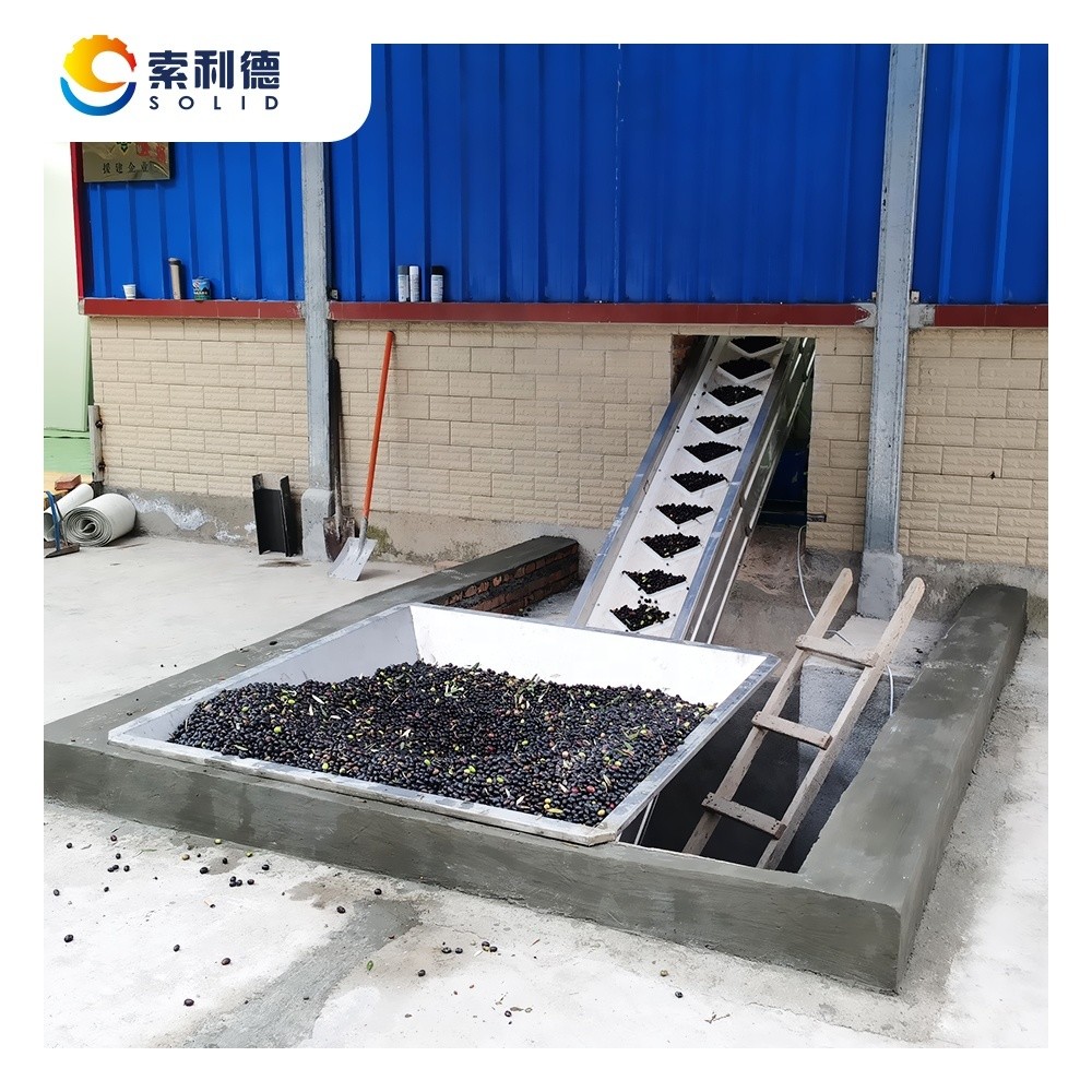 Les olives sont ensuite transportées dans la machine à laver, puis rincées et lavées pour éliminer la poussière grâce à un fort débit d'eau.L'eau est prélevée pour récupération par le réservoir de circulation sous le tamis vibratoire.